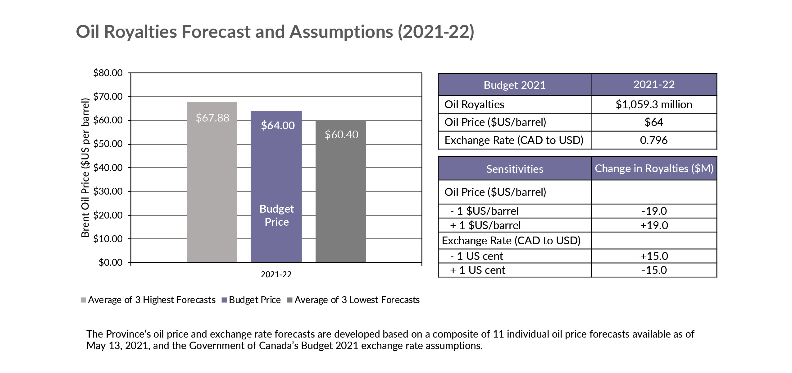 For Budget 2021, oil is projected to be US$64 per barrel and the Canada to United States exchange rate is forecasted at 79.6 cents. These projections are informed by 11 independent oil forecasters.
