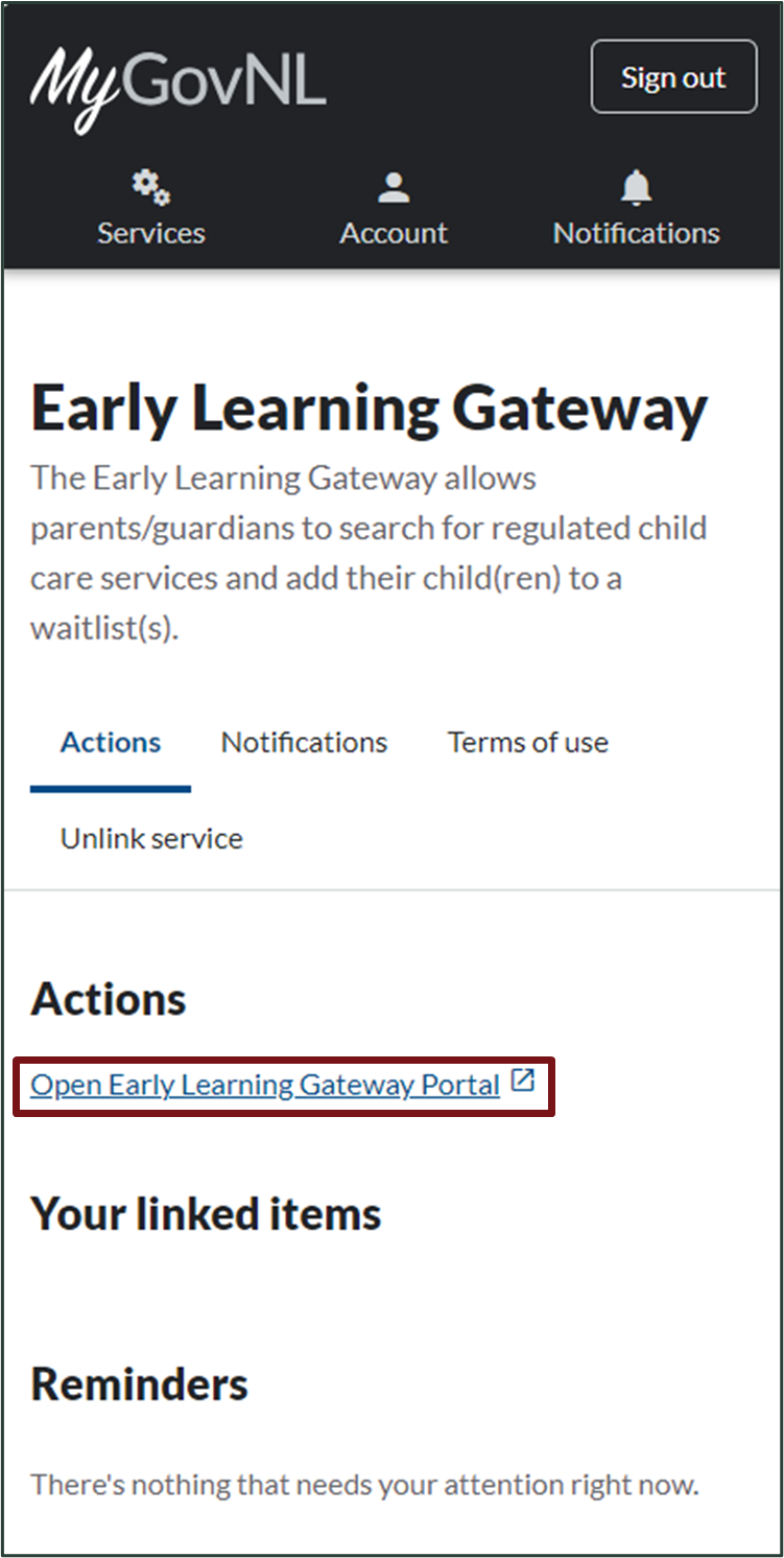 Once logged into your MyGovNL account, click on Early Learning Gateway located under Services.