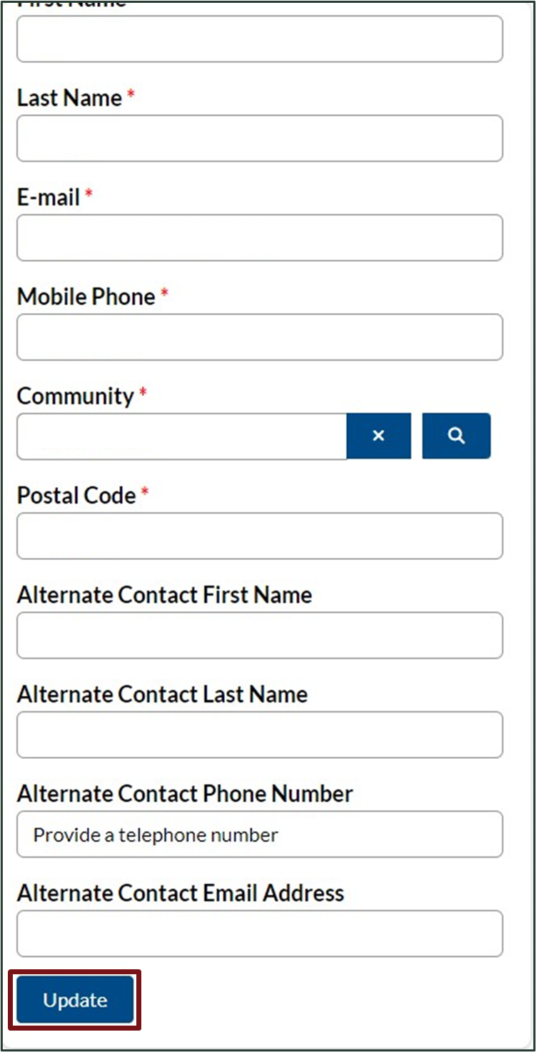On initial login to the Early Learning Gateway Parent Portal, you will be prompted to enter your profile information. Complete the fields and click Update.