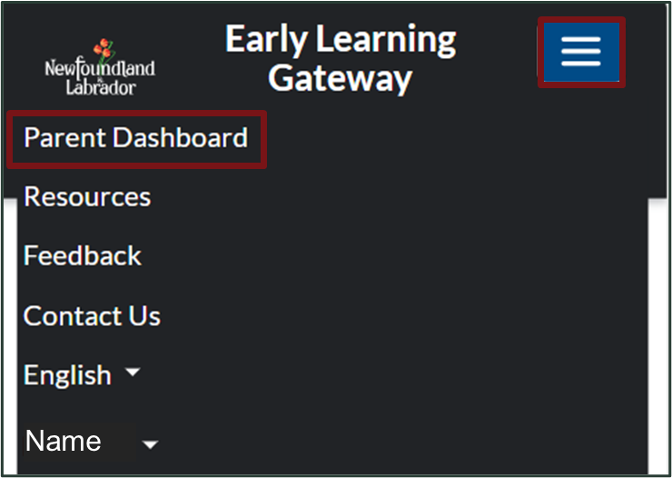 Once you sign into the Early Learning Gateway Parent Portal, select the menu icon, then click Parent Dashboard.