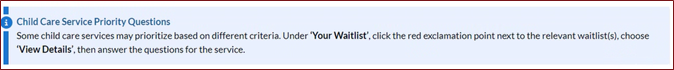 If you added a child to a child care service waitlist, you may receive a notification titled “Child Care Service Priority Questions” in the Early Learning Gateway Parent Portal, prompting you to answer questions for the service. To do this, on the Parent Dashboard navigate to Your Waitlists, click the red exclamation point next to the relevant waitlist(s), choose View Details. Then, answer the questions for the service, and click Submit and Close.
