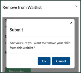 A Submit window will appear to confirm you would like to remove your child from the service waitlist. Click Ok.