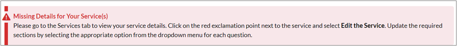 Please note: If you are missing details for your service, you will see the following notification at the top of your screen if you are missing details for your service.