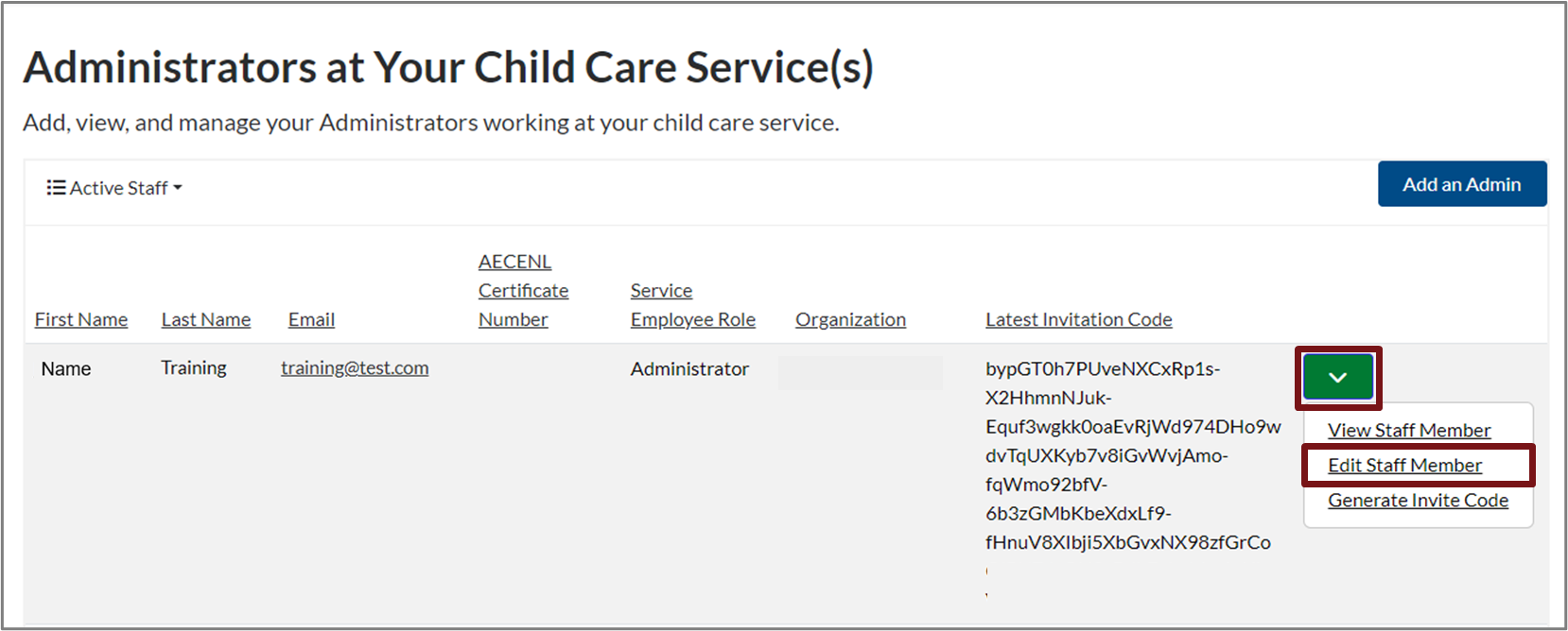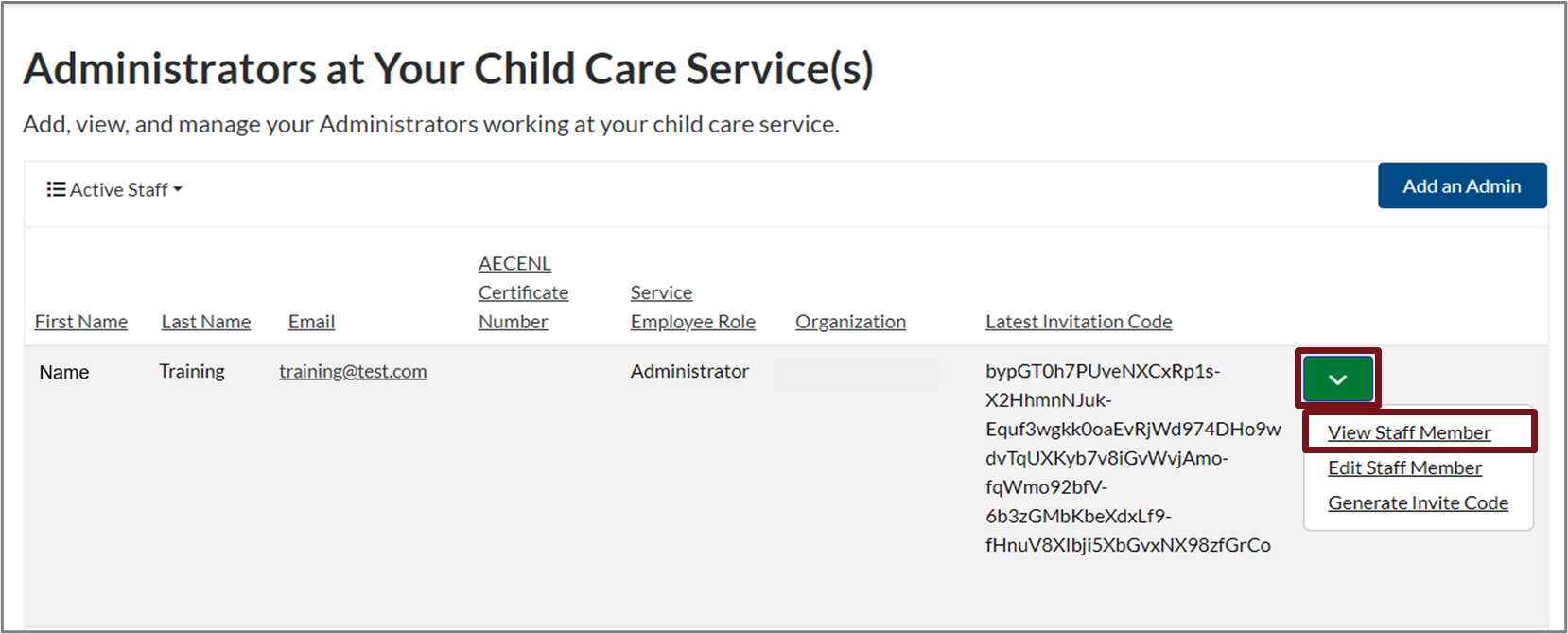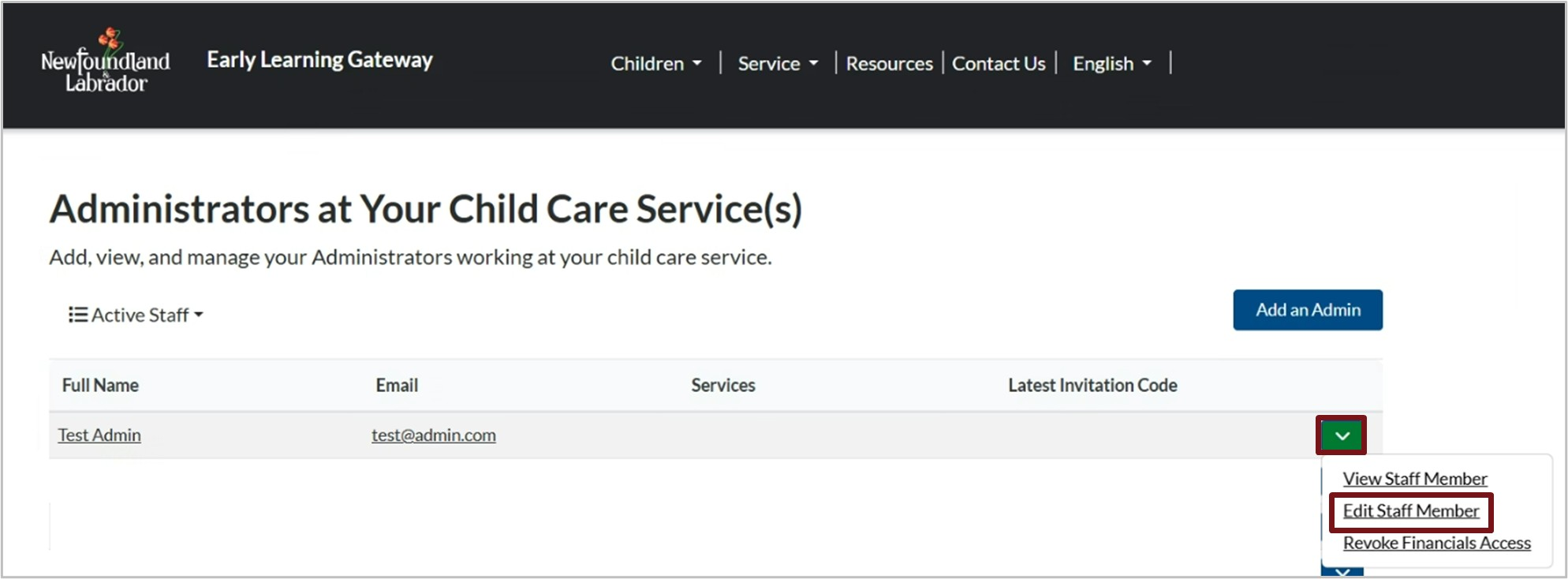 If you have an administrator responsible for managing your child care service waitlist, you can add an admin account and send them an invitation to create a username and password for the Early Learning Gateway Service Portal. To add an administrator to your staff, select Add an Admin.