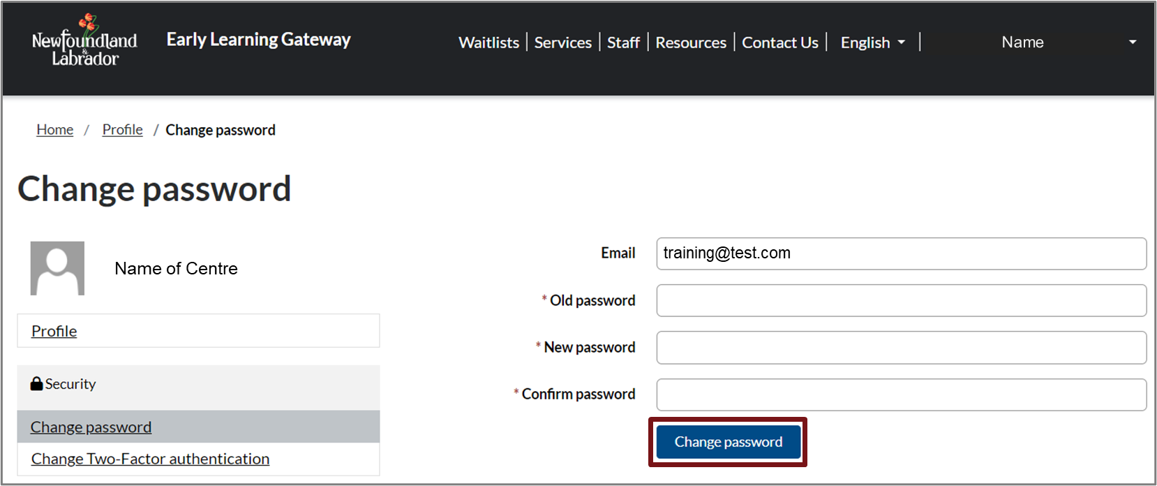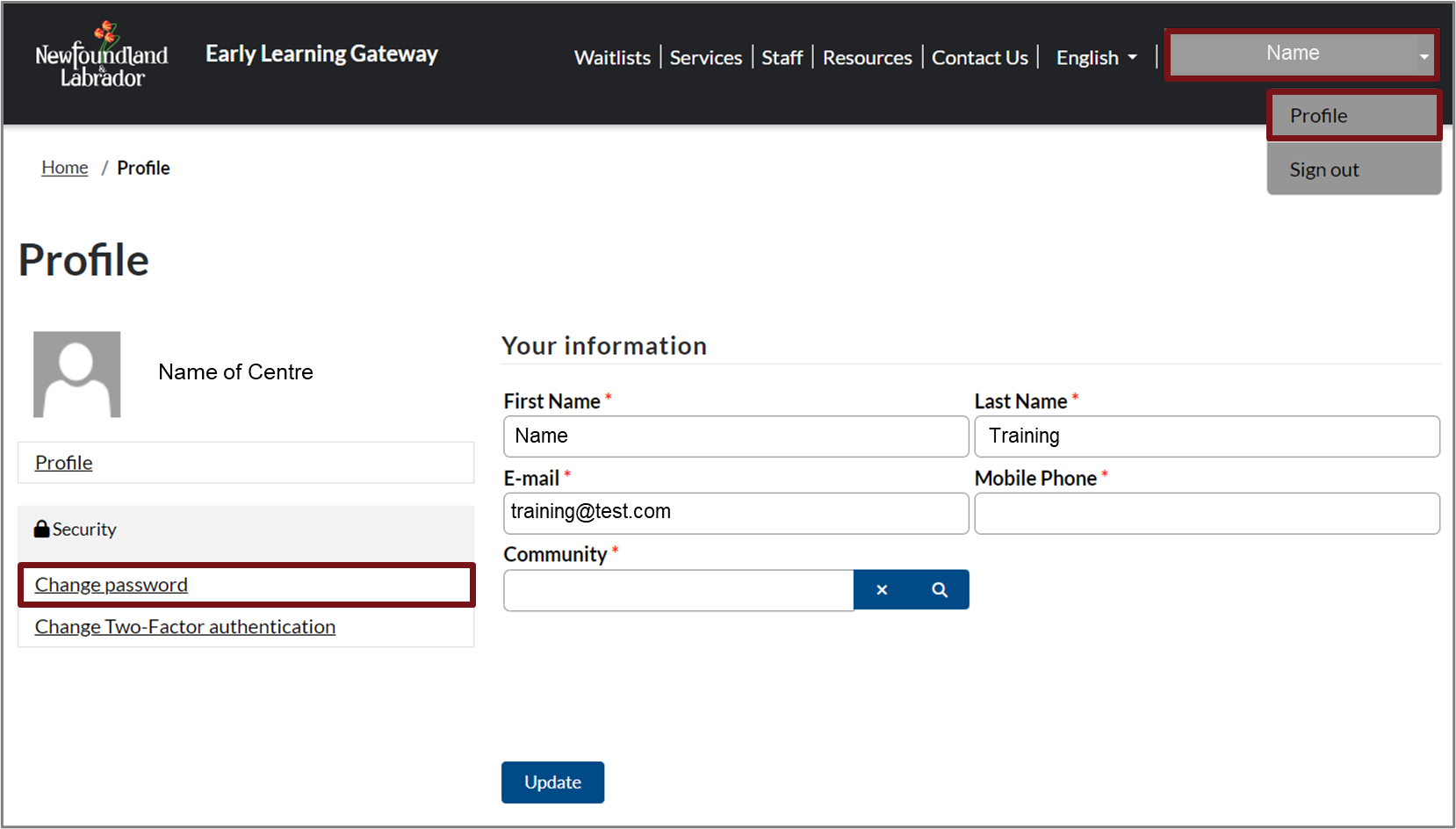 To change your password, sign into the Early Learning Gateway Service Portal, click on your name in the top right corner, then select Profile. If using a mobile device, click the menu icon