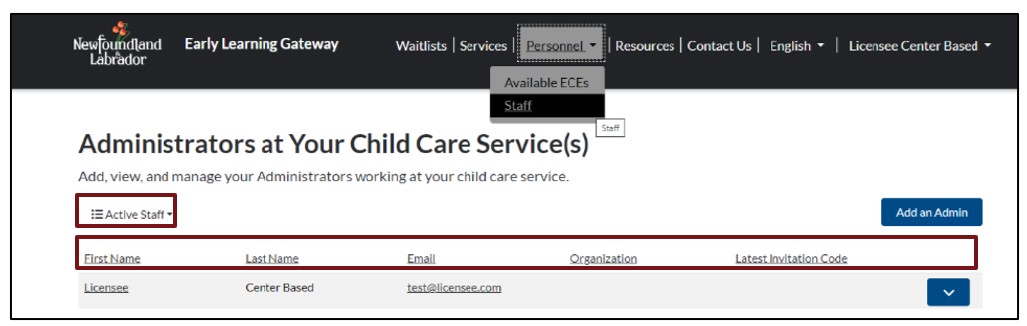 Click the Personnel button at the top of the Early Learning Gateway Service Portal, then select Staff. The Administrators at Your Child Care Service(s) section will display. Child care licensees will be responsible for adding and managing administrator accounts within the Early Learning Gateway Service Portal.