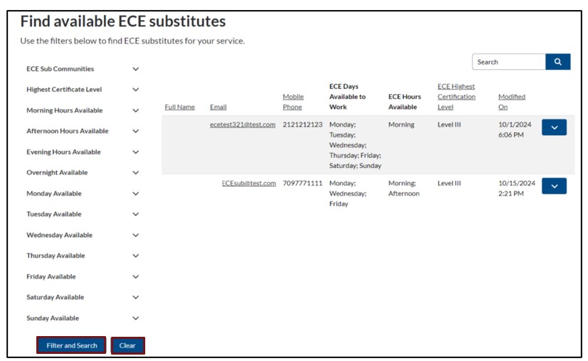 You can filter and find the available ECE substitutes using the search criteria. Simply click the drop-down menu, select the criteria you want to see, and then click Filter and Search. To reset your filters, click Clear.
