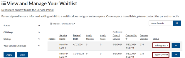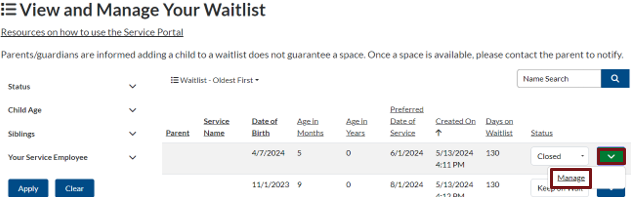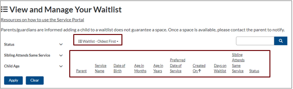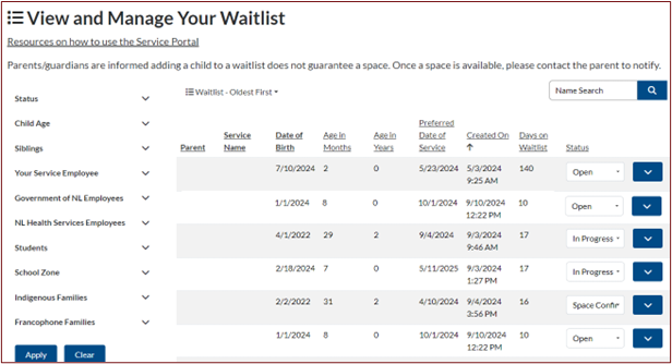 You also have filter options to customize the current view of your waitlist and make it easier to manage. You can filter by Status, whether Sibling attends same service and Child Age. Once you select your preferred filter options, click Apply.