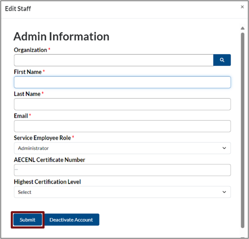 1. Complete the fields on the Admin Information screen and select Submit. Please note: Fields marked with an asterisk (*) are mandatory.