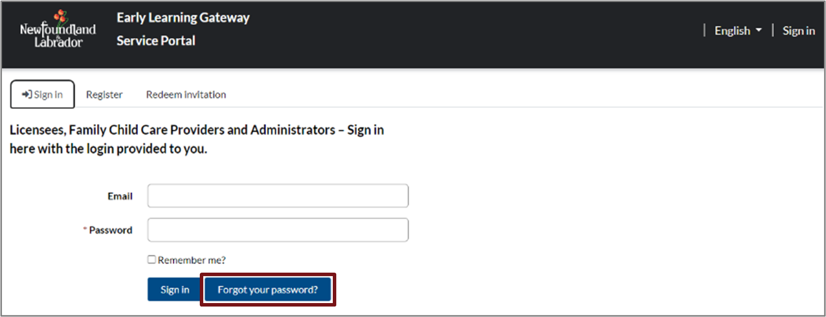 If you forget your password, please select Forget your password on the Early Learning Gateway Service Portal Sign in screen.