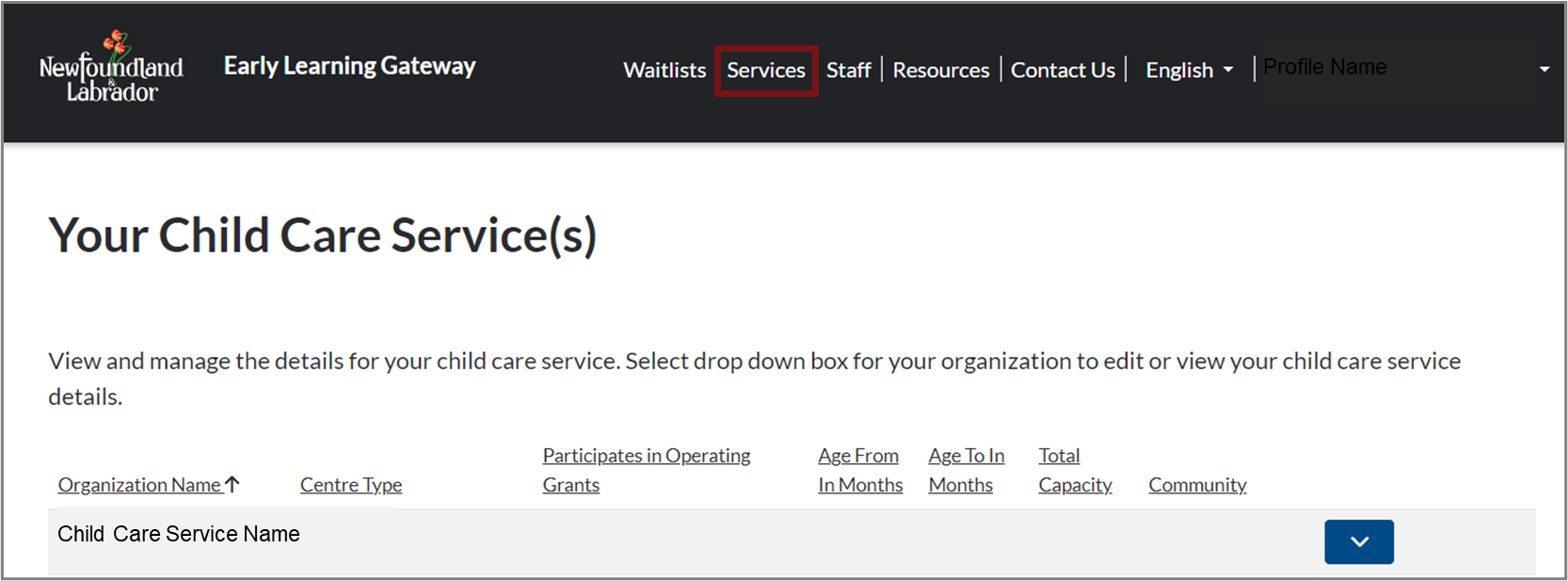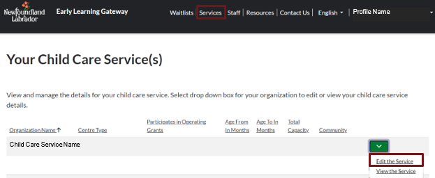 Licensees and administrators can view and manage details for the service by clicking Services at the top of the Service Portal window. You will see any child care services that you manage under the Your Child Care Service(s) section.