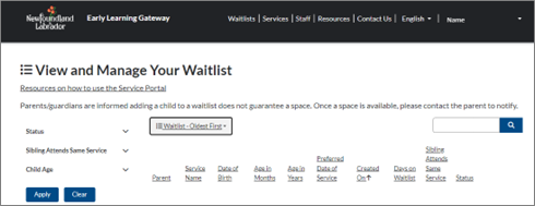 Click Waitlists at the top of the Early Learning Gateway Service Portal. The View and Manage Your Waitlist section will display. The list of parents/guardians who added their child(ren) to your waitlist through the Early Learning Gateway will appear here.