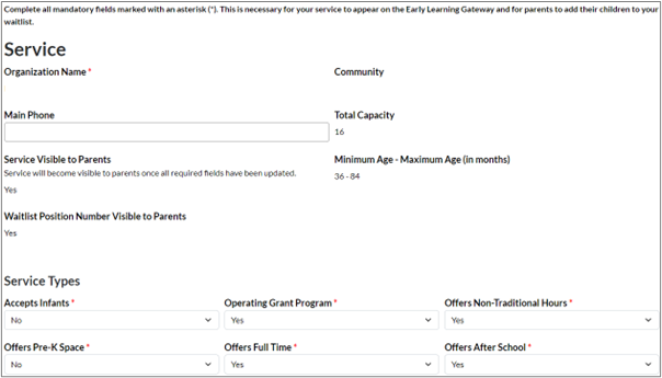New services joining the Early Learning Gateway must complete the mandatory questions to become visible to parents, allowing them to add their child to your waitlist. The parent or guardian will then be able to view this information when they search for services through the parent portal.