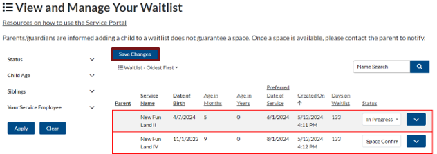 After changing the waitlist status, the entries will display with a red border. Once completed, click Save Changes. Then, your waitlist will appear with the updated status.