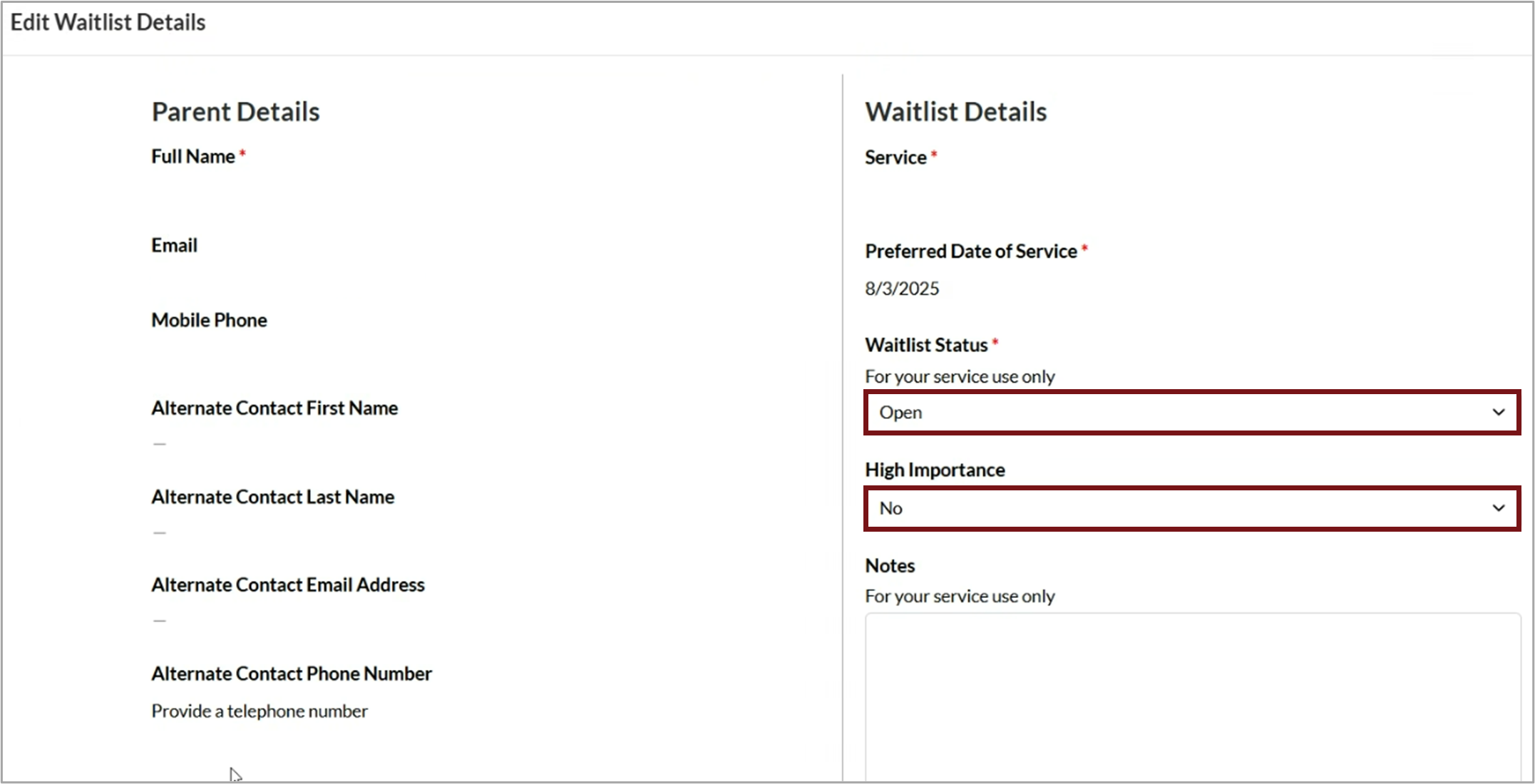 - Waitlist status and notes are for your service use only. If you email a parent/guardian, please exclude personal or health information.