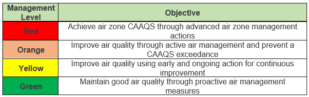 The Air Zone Management Framework consists of four separate air pollution concentration ranges, called Management Levels. Each management level is colour-coded, and associated with a suite of air management, monitoring and reporting actions that become progressively more rigorous as air quality approaches the CAAQS. The Management Levels are: