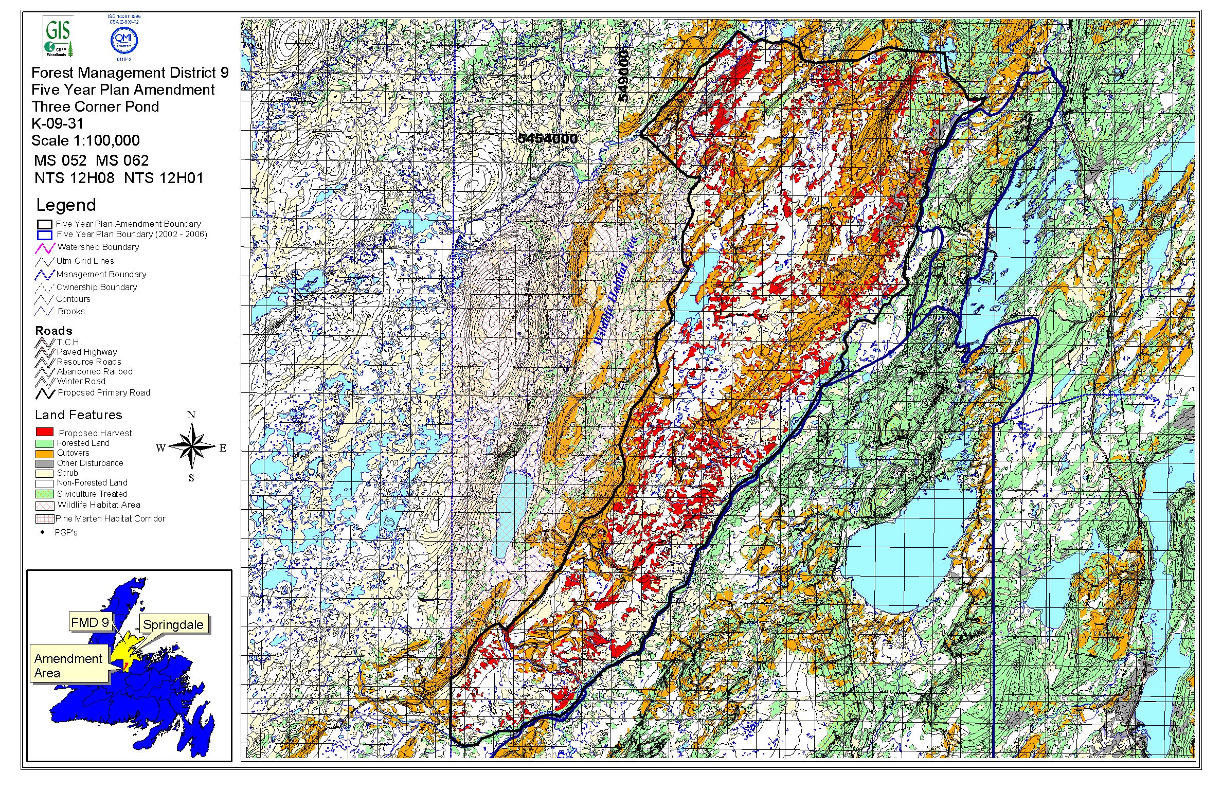 The proponent proposes an amendment to its Forest Management District 9 Five Year Operating Plan 2001-2006. Forest Management District 9 is located on the north central region of the Island between Seal Bay and White Bay. The amendment applies to a proposed total timber harvest of 98,780 cubic meters covering an area of 1,097 hectares near Three Corner Pond, located to the northwest of Dawes Pond, in the Millertown Junction Area. An additional 6 kilometres of primary forestry road are planned for the amendment. Road construction and harvesting is scheduled to begin as early as June 1, 2005 and continue until December 31, 2006.