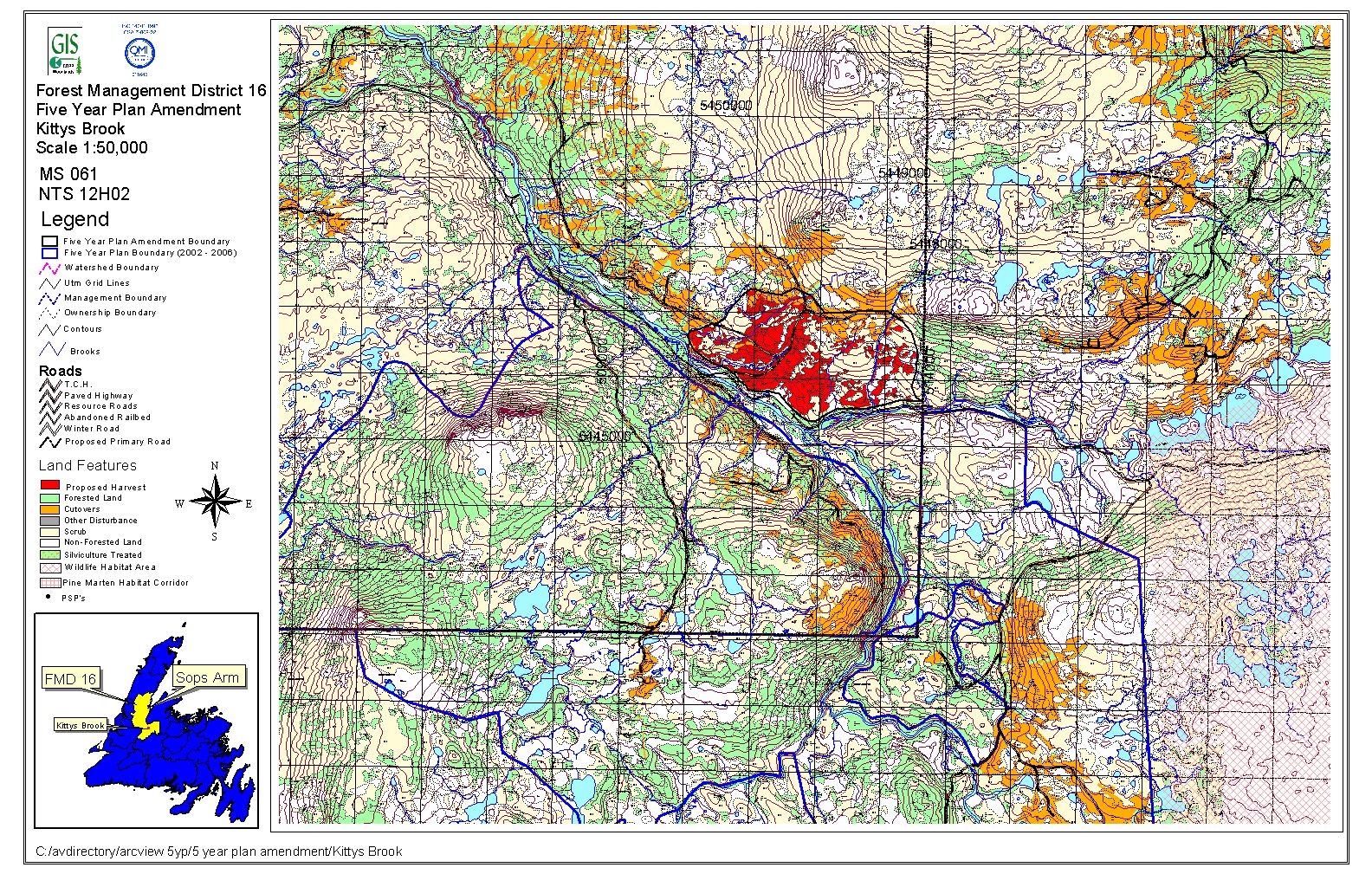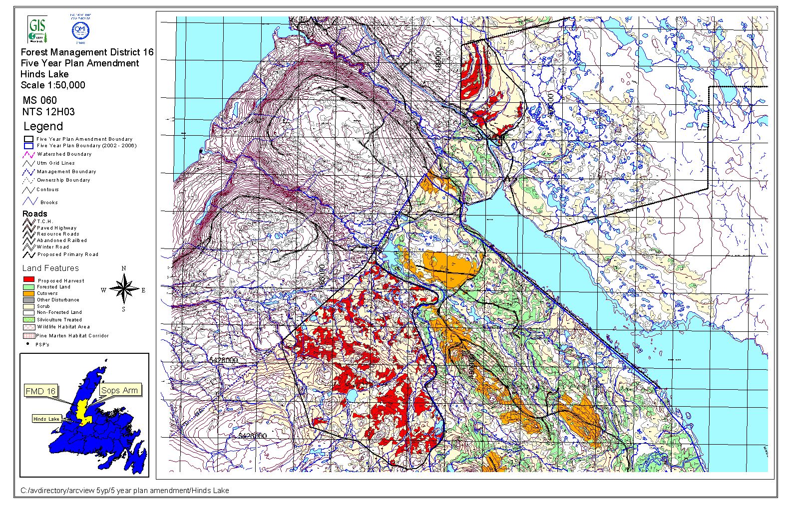 The proponent proposes amendments to its Forest Management District 16 Five Year Operating Plan 2002-2006.Forest Management District 16 is located on the Northern Peninsula, bounded by White Bay in the east, Gros Morne Park in the west, and Gaff Topsails in the south. The amendments apply to a proposed total timber harvest of 148, 668 cubic meters in the Burnt Hill Lake (51,421 cubic meters), Hinds Lake (40,424 cubic meters), Kitty’s Brook (17,852 cubic meters), and Goose Lake Road (38,971 cubic meters) Operating Areas. No primary forest access roads are proposed. Road construction and harvesting is scheduled to begin as early as April 1, 2005 and continue until December 31, 2006.