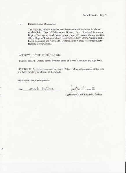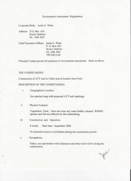 The proponent proposes to construct an All Terrain Vehicle (ATV) trail to a remote cottage on the western side of Eastern Arm Pond, near Rocky Harbour , in western Newfoundland . The trail would begin from an existing trail, and be approximately 900 metres long by 1.5 metres wide. Construction of the trail will be with hand tools and is planned for the Fall of 2006.