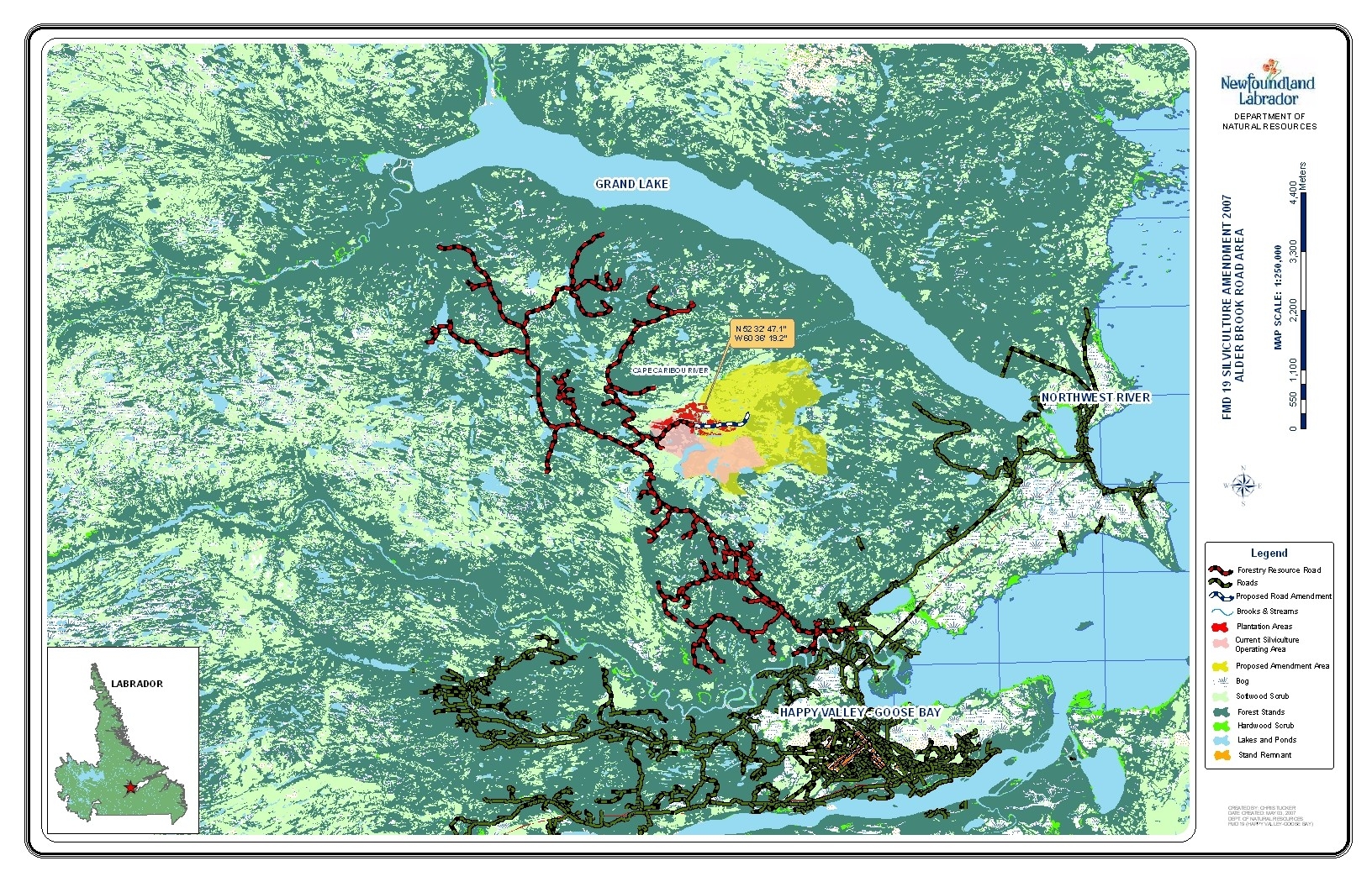 The Department of Natural Resources proposes an amendment to the proposed silviculture area and road construction as outlined in the District 19a Five Year Operating Plan (2003 – 2007). The purpose of this amendment is to plant trees to replace those burned during a forest fire in 1985. The site is located in central Labrador approximately 40 kilometres north of the town of Happy Valley Goose Bay , along the Grand Lake Forest Access Road . The amendment covers 180 hectares, and includes 5 kilometres of new forest access road.