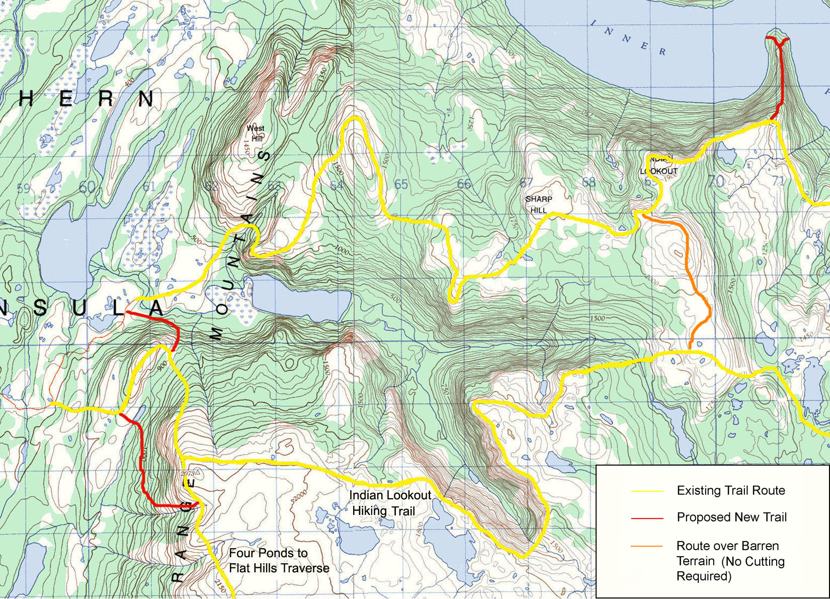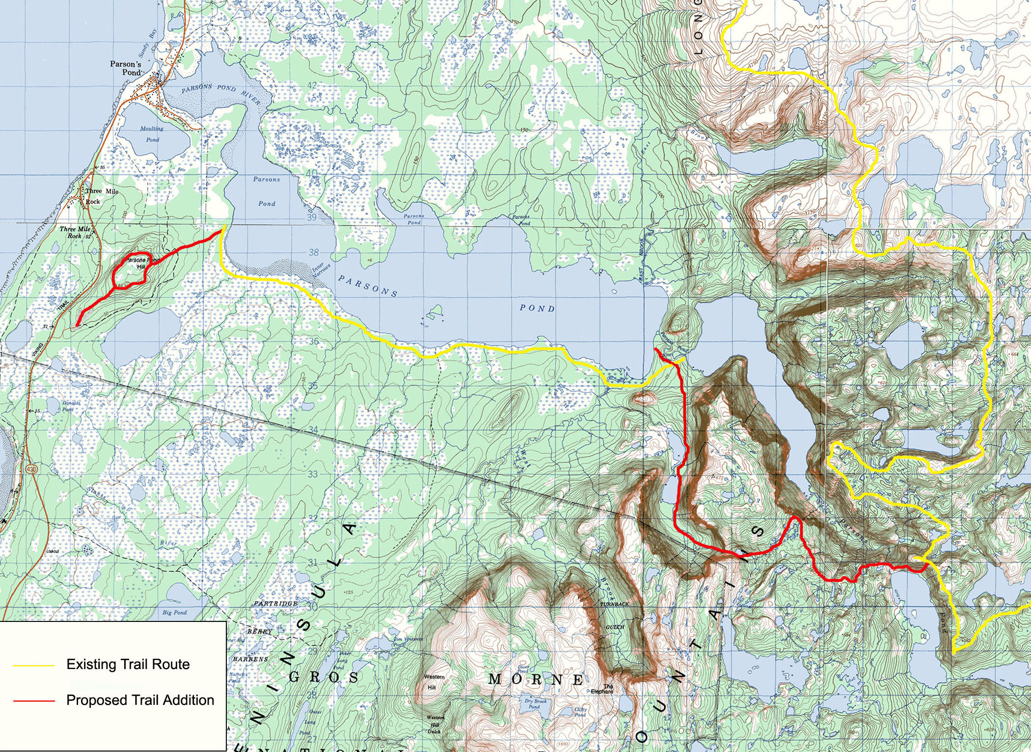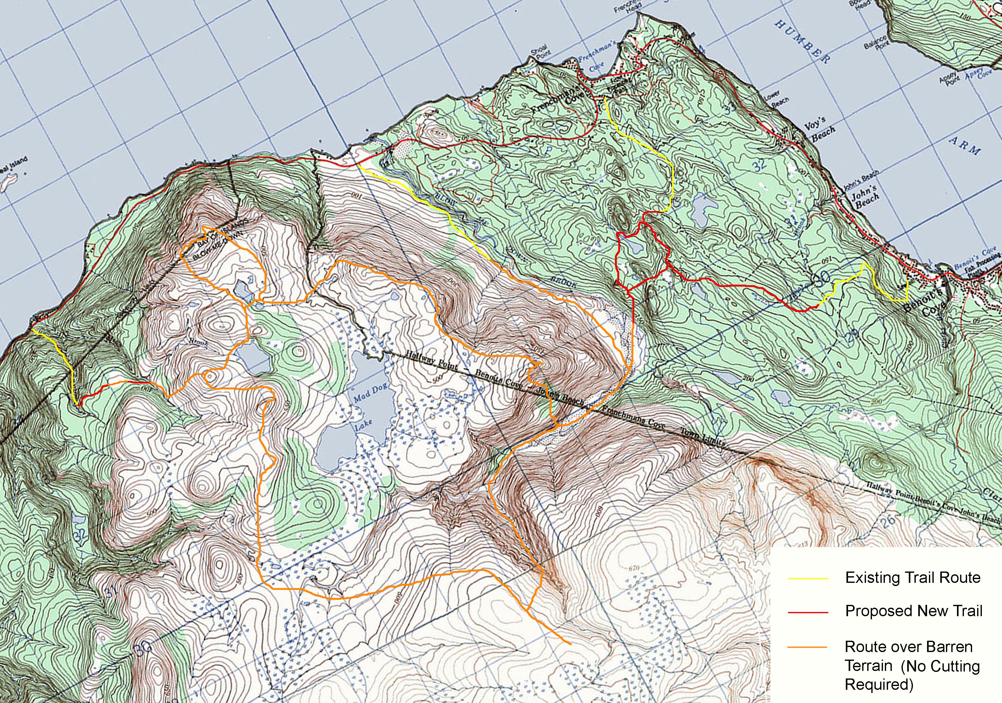 The proponent plans to develop additional or amend trail routes to the hiking trail along the Long Range Mountains of Western Newfoundland from Channel-Port aux Basques in the south to Belle Isle in the north. The proposed trail will be an extension of the US Appalachian Trail and International Trail from New Brunswick to the Gaspe Peninsula in Quebec . The Western Newfoundland section will comprise 550 kilometres of new non-contiguous walking/hiking trail connected to existing trails and roads to cover the route. The trail will be approximately one metre wide over original soil with no bridges or boardwalks. The trail development has already begun in some areas. The first phase (Indian Lookout Trail) was developed in 2006, with three additional trails developed in 2007 (Indian Head, Humber Valley and Flat Hills Trails). The trails developed in 2007 were previously registered and released from the Environmental Assessment process in 2005. New sections of trail range in length from 1 km to 90 kms. The trail is planned to be developed over a six-year period.