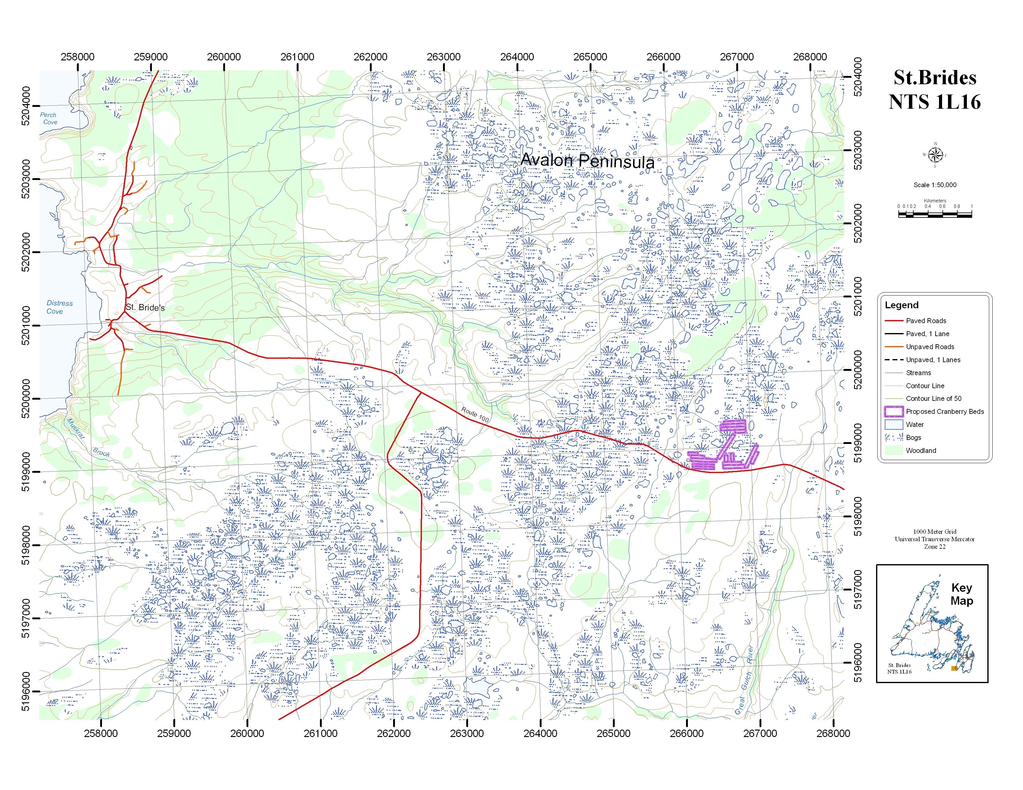 The proposed undertaking will be located 7 kilometres east of St. Bride’s, along route 100. The 50 acre site will have 38 acres of cranberry beds and an 80 metre access road. There will be brush cutting, ditching, placement of sand beds, and installation of water control structures and drainage tiles, during the construction phase. The site will be developed over a five year period with construction tentatively scheduled to begin this fall.