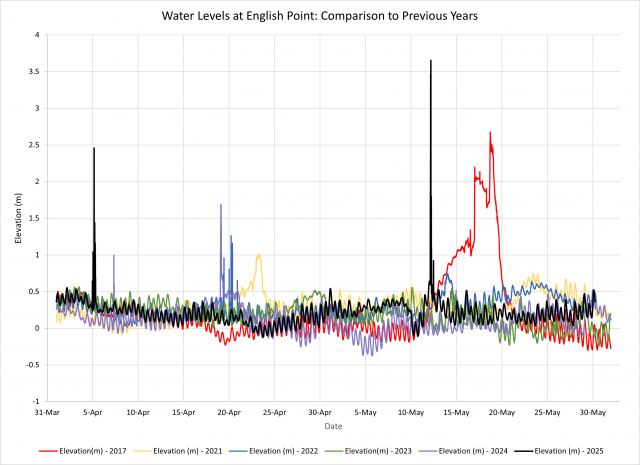 Water levels at English Point have been graphed for 2021-2025 from April 1st to May 31st. Please note that this station had an assumed elevation at the time of flooding in 2017 and was not geodetically tied-in (i.e., it was a measurement used to show the change in water level only). In 2019, it was surveyed and the elevations are now geodetic. For purposes of creating this graph a correction offset of (-)2.210 m has been applied to the 2017 data. Monitoring the water levels at this point on the river show the water level rising due to ice build-up and then water levels dropping from when the ice cleared out.