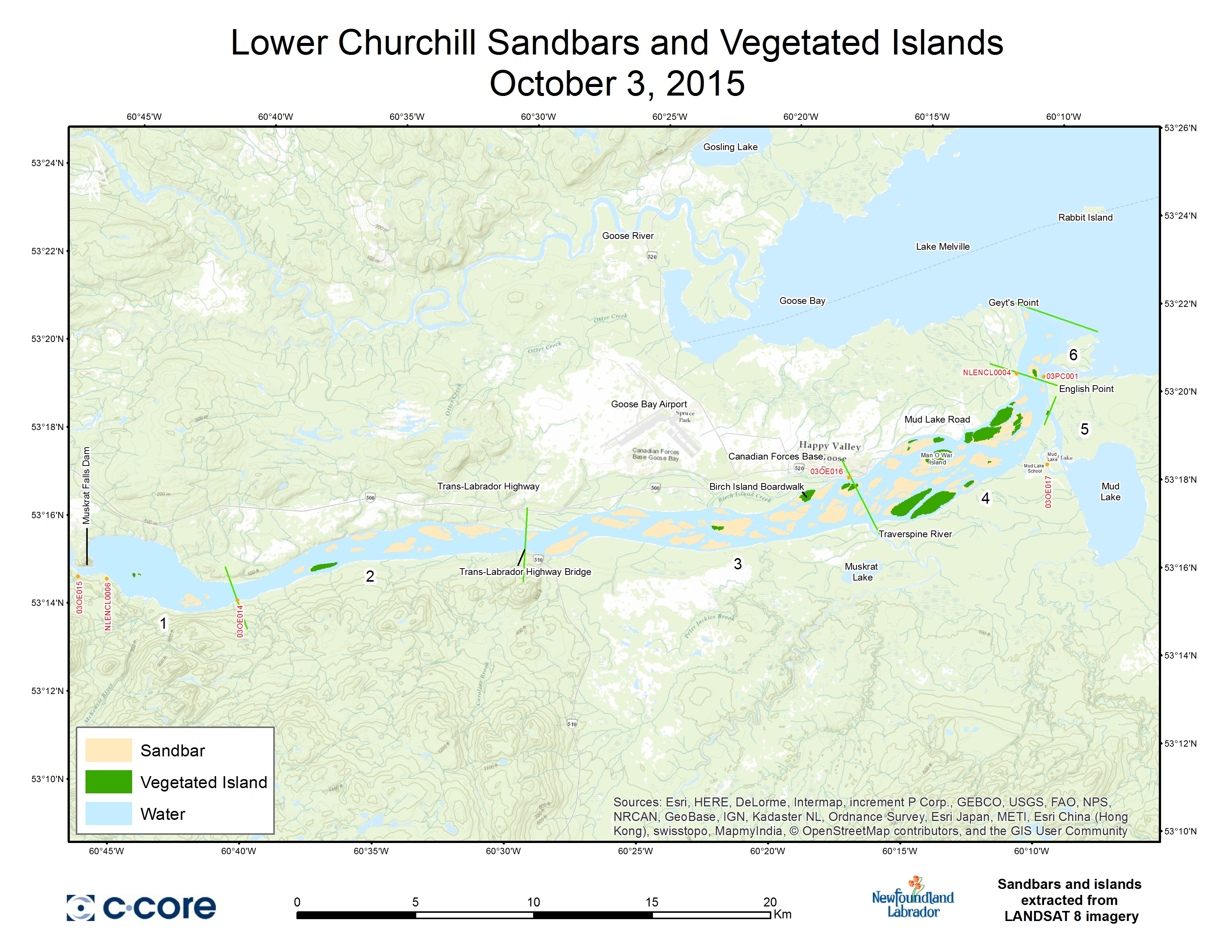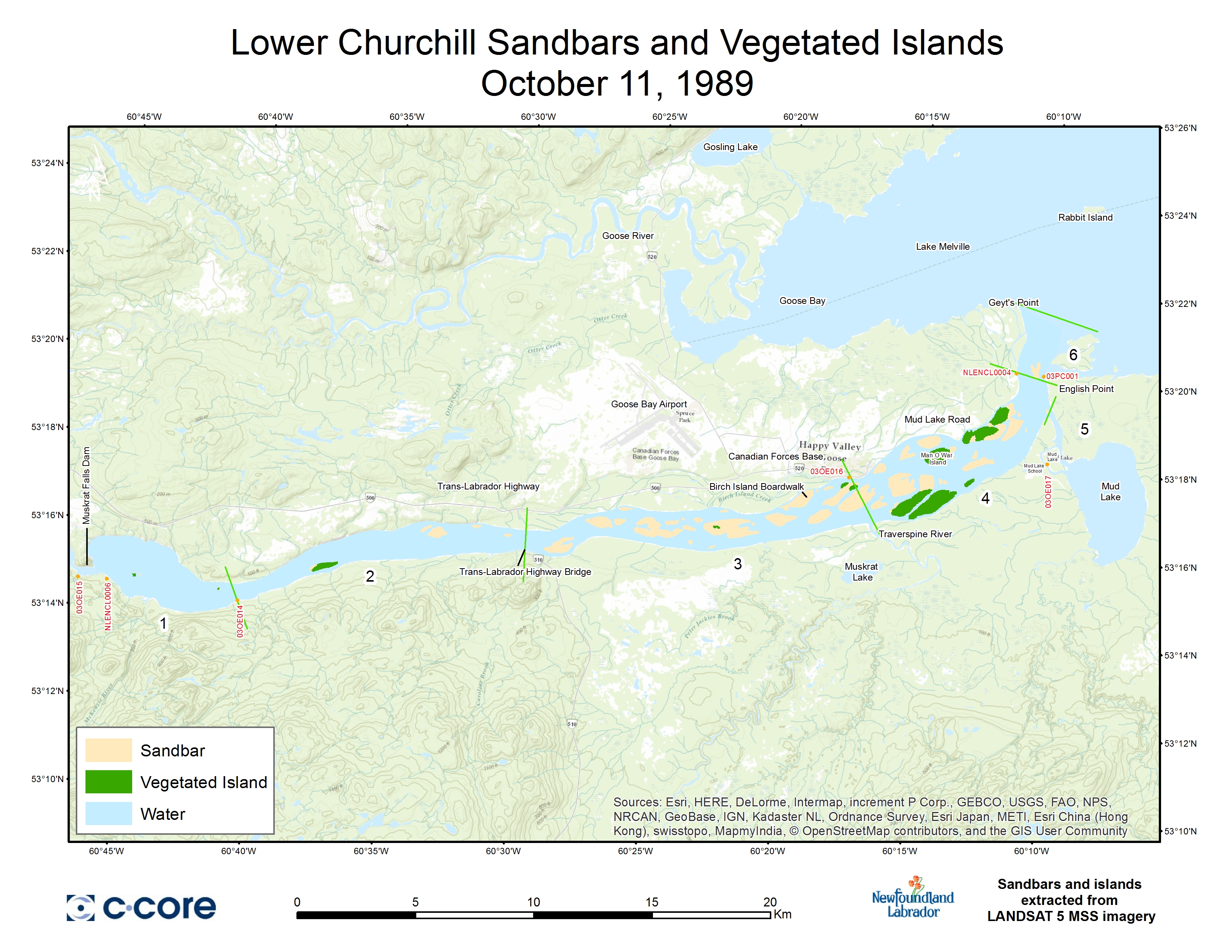 Cloud-free LANDSAT imagery collected since 1972 were analyzed to evaluate the occurrence of sandbars and islands in the Lower Churchill River. By limiting valid acquisition dates to October/early November, an attempt was made to select only images acquired before the onset of ice formation. A new sandbar map will be added every year in October/early November.