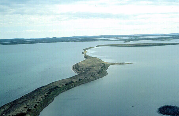 Here is an esker stretching across a modern lake in central Labrador. Eskers commonly have sharp crests, although this one has a flat top. It has been eroded by the glacier after it was deposited. Eskers are good sources of sand and gravel, and have been used as transportation routes, e.g., roads and railways). They are common features in Newfoundland and Labrador.