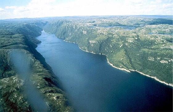 Fiords, such as this one on the south coast of Newfoundland, are long, narrow arm of the sea with steep-sides. They are formed by flooding of a valley by the sea.