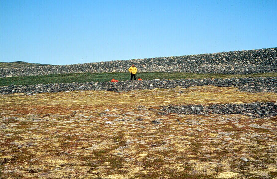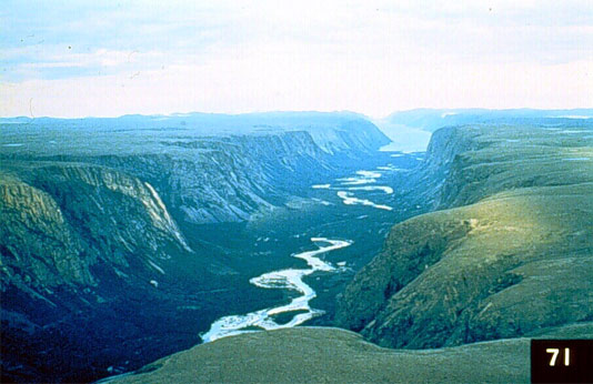 A meandering river in a steep-sided, straight valley. Valleys like this one near Nain, Labrador, were major outlets of glaciers from the interior toward the coast.