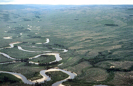 A river winding (meandering) from side to side in wide loops as it flows across flat country. Many features typical of meandering rivers are seen in this photo of the Sebaskachu River, Labrador, including erosion on the outside of the bends (out-banks) and deposition on the inside of the beds (point bars). Note the oxbow lake in the centre foreground of this picture.