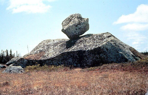 A large, angular boulder of granite perched on a ridge of granite was left here by a glacier when it melted. This perched erratic occurs south of Noel Paul’s Brook, central Newfoundland.