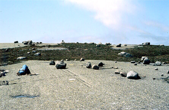 This photo, taken near Burgeo, southern Newfoundland, shows striations, grooves and erratics on a glacially smoothed outcrop. Large fragments can form long grooves in the rock surface as can be seen in the centre of this picture.