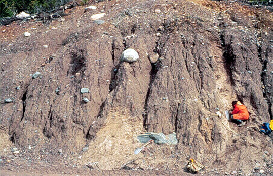 An example of bedded, unconsolidated, glacial sand and gravel deposited where a meltwater stream flowed into the sea, from the Springdale area, central Newfoundland. Sea-levels were much higher than present in many parts of the province at the end of the last Ice Age.
