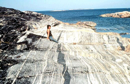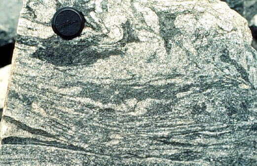 A folded mafic dyke, in this photo, has been metamorphosed to mostly amphibole (hornblende) and plagioclase; it cuts across marble derived from limestone. (Rigolet, Labrador).