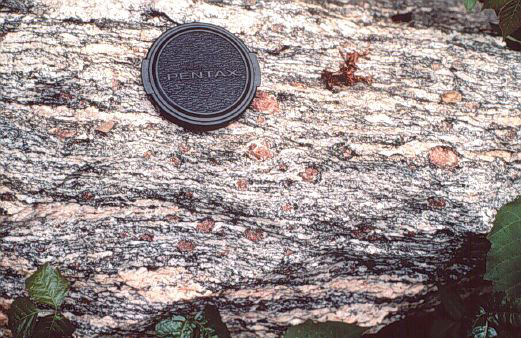 A planar foliation or schistosity defined by biotite, quartz and feldspar is represented in the photograph on the left. The eye-shaped (augen) red garnet crystals are called porphyroblasts. A widely-spaced, mineral banding, defined by light and dark bands, indicate that the rock also has a gneissic component (see Gneiss). This sample comes from the Port aux Basques area.