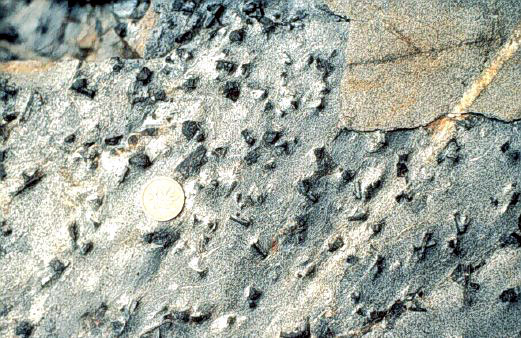 The photo on the right shows staurolite crystals, called porphyroblasts, in a mica schist. Note the small quartz vein in the upper right-hand corner. This sample comes from the Bay d’Espoir area.