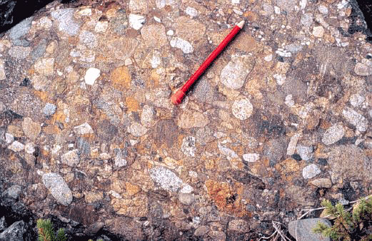 This conglomerate of an assortment of well-rounded clasts (note plutonic-rock clasts) outcrops near Presque Harbour, Placentia Bay. The matrix in this conglomerate constitutes a very small proportion of the rock and is restricted to the space between clasts.