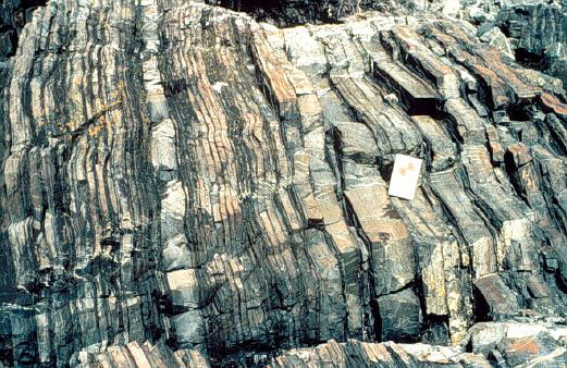 The photo, from the Gander Lake area, shows dark siltstone interbedded in a rhythmic fashion with white sandstone beds. These sedimentary rocks form part of a flysch sequence. The beds were originally deposited nearly horizontal, but are vertically dipping now because of folding.