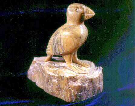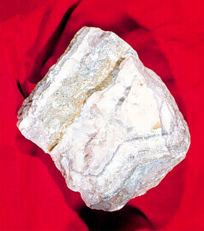 The physical properties of pyrophyllite and talc are practically identical. The main difference is that pyrophyllite has an abundance of aluminum in its chemical make-up and talc has an abundance of magnesium. The photo of the sculpture, carved from pyrophyllite, is the work of Nath Noel, The Stone Garden Gallery, St. John’s, NL. It is the property of Frank Blackwood. The photo on the right is a sample of the raw mineral.