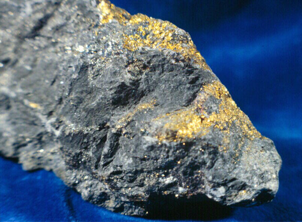 Gold (Au) is a precious metal used in jewelry. It has many industrial and medical applications. The photo on the left contains a specimen of gold in quartz vein is from an unknown location in Newfoundland. This sample is owned by the Provincial Museum.
