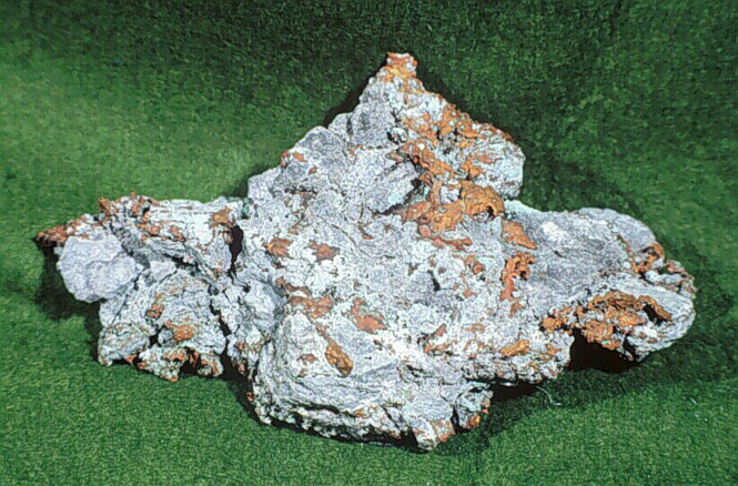 Native copper (Cu) is the naturally occurring elemental form of copper. Copper was one of the first metals used by man. It has many uses and in the home water pipes and electrical wires are made from copper. The photograph shows a typical sample of native copper. This sample is owned by the Provincial Museum.