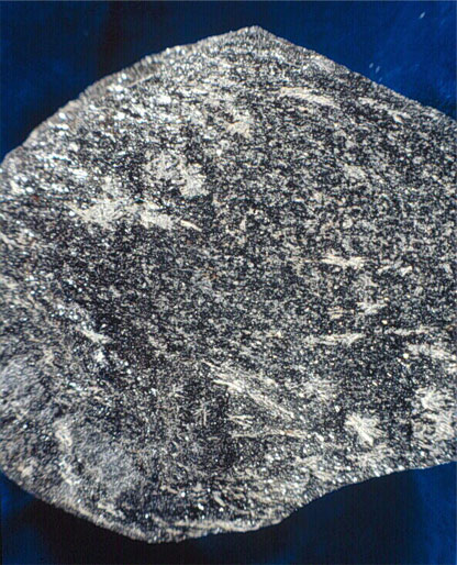 Molybdenite (MoS2), commonly called “Moly”, is a molybdenum sulphide that is the principal source of molybdenum. The sample shown is from a granite body in the Bay d’Espoir area of southern Newfoundland. It is from the Steven V. Papezik Collection, MUN.