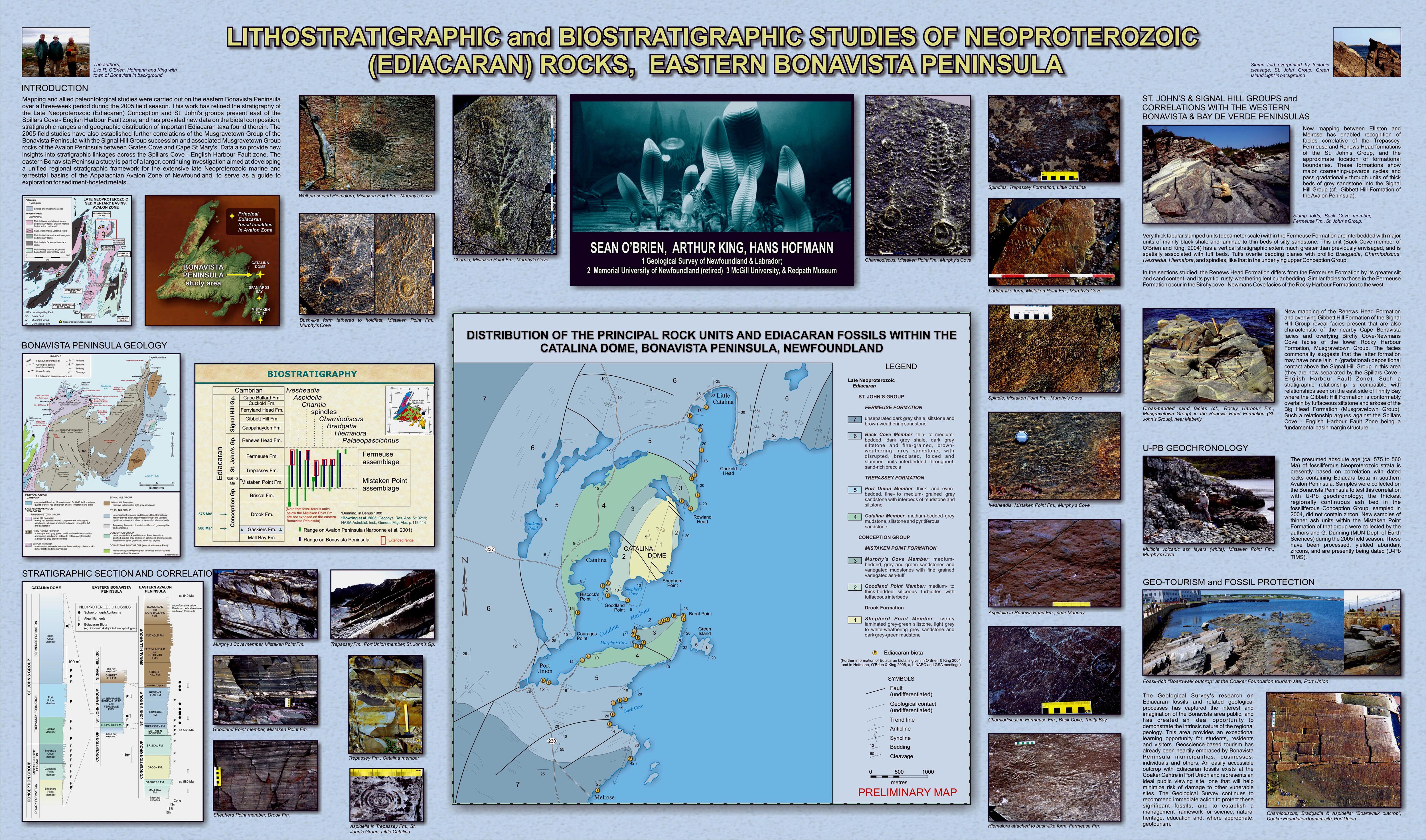 These two posters (1 MB) reveal the ancient past of the coastal rocks containing the remarkable fossils found in the Trinity Bay North – Little Catalina area on the Bonavista Peninsula of Newfoundland. - Lithographic and Biostratigraphic Studies of Neoproterozoic (Ediacaran) Rocks, Eastern Bonavista Peninsula