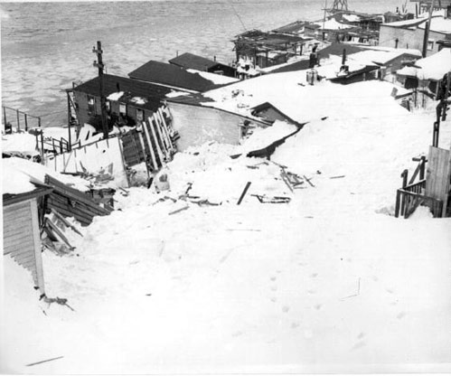 A ferocious storm hit St. John’s on the night of the 16th of February, with winds reported up to 135 mph, dumping 22″ of snow. At 1:05 am, residents in the Outer Battery heard a sound described as louder than a clap of thunder. An avalanche struck two houses sweeping them down-slope and into the rear of two other houses. The two houses, belonging to the families of Clarence Wells, and Jim Piercey, contained 14 people. Clarence Wells was the nephew of Alfred Wells, whose family was hit by the 1921 avalanche. The top story of the Piercey house was ripped off, and the Wells house completely demolished.