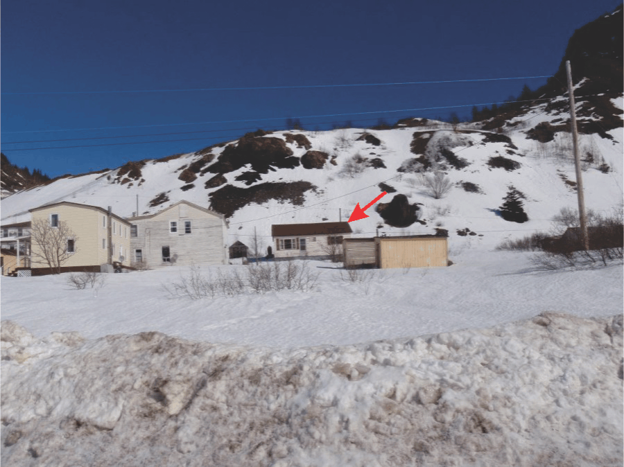 Photograph showing house (indicated by arrow) impacted by the 1987 avalanche (photo from David Liverman).
