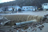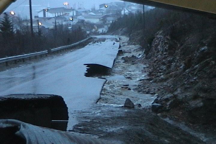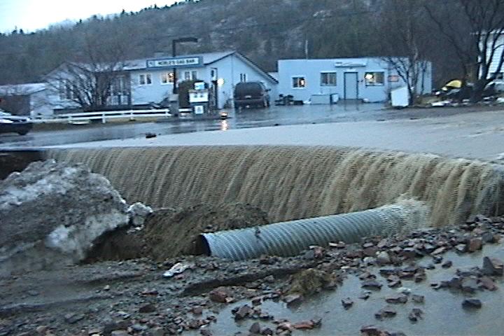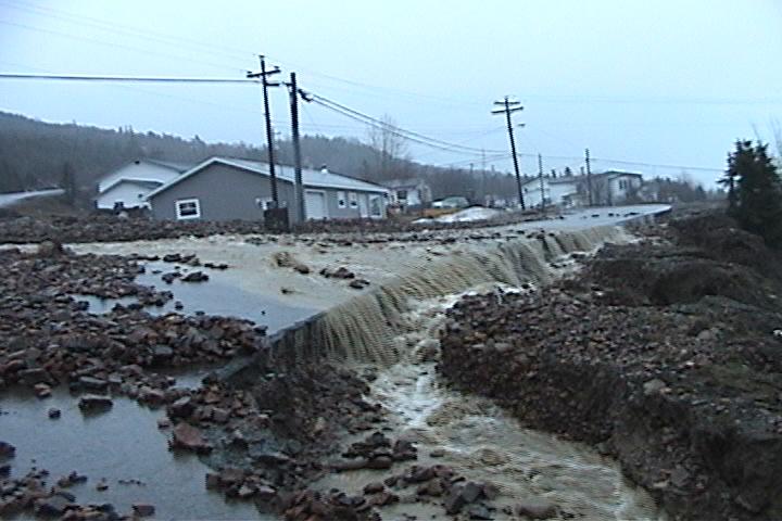 Heavy rainfall caused widespread damage in communities in north-east Newfoundland, including Middle Arm, Burlington, Smith’s Harbour, Indian Bay, and Harry’s Harbour. In total 90 communities were affected. Over 33 mm of rain fell on the Baie Verte Peninsula on April 18, resulting in extensive flooding. Middle Arm was the hardest hit community, with over 50 homes flooded. One house was also struck by a landslide. Flooding started after a culvert was blocked during heavy rain. town infrastructure was seriously damaged, including the sewer system, with damage estimated by the mayor as being “in the millions of dollars”. Flooding caused the washing out of the roads to Burlington, Smith’s Harbour and Middle Arm, cutting them off from the main Baie Verte highway. At least one resident had to be evacuated by helicopter due to medical reasons. Homes were also flooded in Burlington and Harry’s Harbour, and roads were washed out in Indian Bay and Fleur-de- Lys. The road to Rattling Brook was also washed out, isolating the community. Springdale also was affected by flooding, with Noble’s construction estimating $30,000 worth of damage.