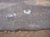 Shown in this picture are germinated corn plants, still under the plastic. The plastic mulch provides a warm environment, with protection from wind and frost. Small perforations along the seeded areas allow the exchange of gasses and the entry of rainwater.