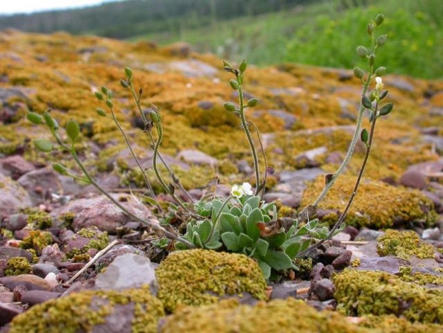 | Low northern rockcress is a small, perennial herbaceous plant in the mustard family. It grows to about 10 cm tall and has small white flowers. Unlike the two braya species, to which it is closely related, the flower stalks can be branched. The low northern rockcress was discovered in Newfoundland in 1914 and is still only known from one location on the west coast of the island, where it lives on limestone barrens found on exposed mountain ridges. |
